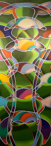 Ella se apropia de las “pellizas”, incontables retacitos de telas que suelen convertir en tapices. Hace tiempo, había captado las posibilidades –formales y expresivas- que ofrece esa técnica textil artesanal, y, hoy más que nunca, las transforma en una red“mágica”, que curvea, asciende, desciende, se trepa por las paredes, cubre el piso,brota en recovecos… Hasta erige laberintos que nosotros, los visitantes, recorremos gustosamente. ¡Colores y formas, huecos y recortes se adueñan del ambiente!